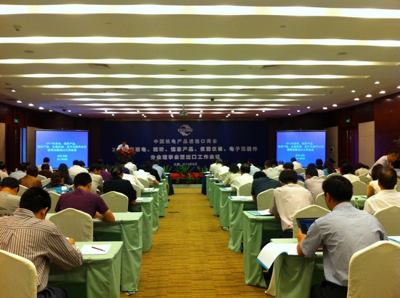 8月24日,由中國機電產品進出口商會主辦的“2011年家電、視聽、信息產品、儀器儀表、電子元器件分會理事會暨出口工作會議”在合肥天鵝湖大酒店舉行。作為機電商會視聽分會的理事單位,安糧國際總經理助理吳國杰等人參加了會議。
