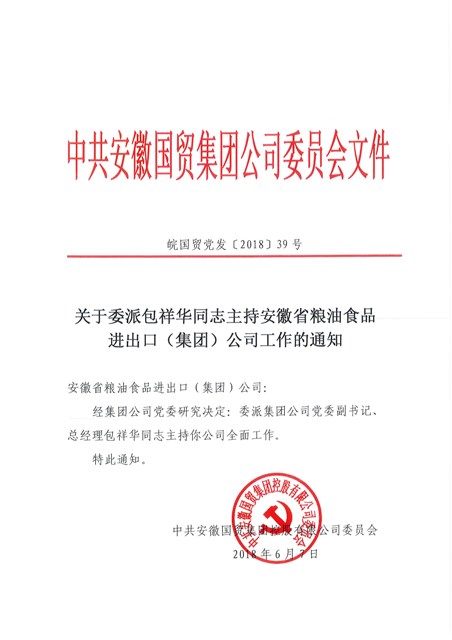 按照會(huì)議安排,首先由李明輝同志受國(guó)貿(mào)集團(tuán)黨委委托宣讀《關(guān)于委派包祥華同志主持安徽省糧油食品進(jìn)出口(集團(tuán))公司工作的通知》,包祥華同志、范陽(yáng)同志先后講話。