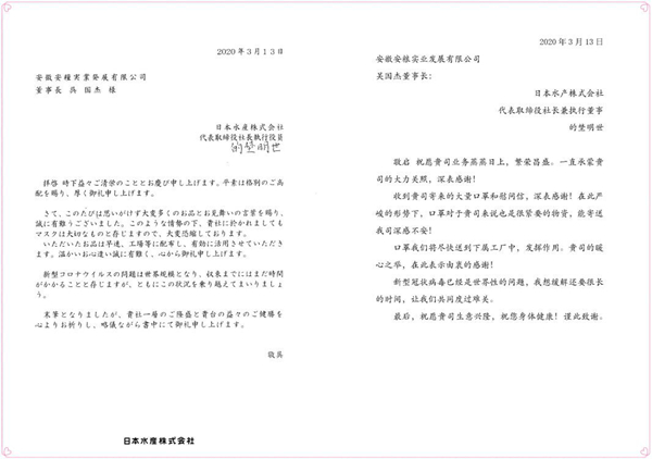 近日,日本水產株式會社的感謝信從東京寄到安糧實業,用以表達對安糧實業捐助其10000只口罩的衷心感謝。