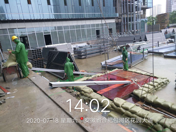針對入梅以來嚴峻的防汛形勢,已交付及在運營項目積極協調物業公司,共同迎戰強降水天氣。位于合作化路和南二環交口的安糧國貿中心是此次防汛形勢較嚴峻的重點項目,特別是降雨量突破合肥市歷史極值的7月18至19日,積水內澇直接影響到地下室的安全。險情出現時,一線人員及時匯報,各崗位人員在半個小時內到崗參與排險工作。項目部對地庫出入口等易形成倒灌水的危險區域安排工作人員堆砌沙袋,打開集水井蓋板,保證積水最大流量的排放。同時配合唯品會工作人員啟動區域排水泵,對易積水難排水區域進行再清理再疏通,隨著南二環和合作化路積水水位逐漸下降,安糧國貿中心順利通過了此次防汛考驗。