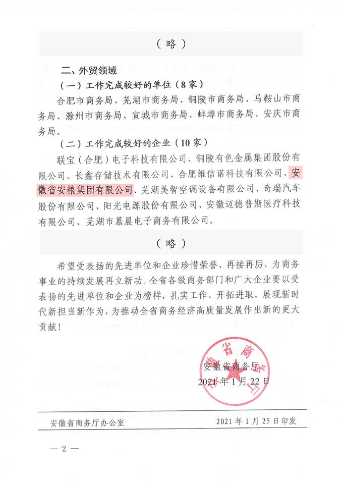 安糧集團2020年以進出口額超22.46億美元(海關統計),增速超28.56%的業績,作為省內唯一一家入圍的專業外貿公司榮獲省商務廳的表彰。