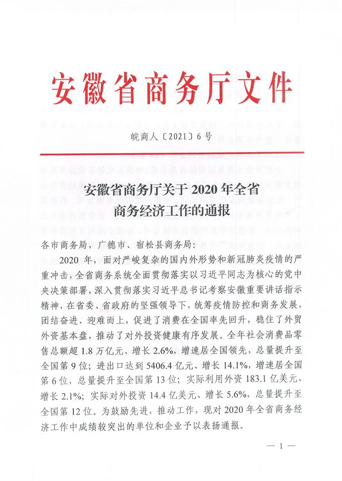 全省商務工作電視電話會議2021年1月21日上午在合肥召開。會上,省商務廳張箭廳長對2020年全省商務經濟工作中成績較突出的單位和企業予以表揚通報。