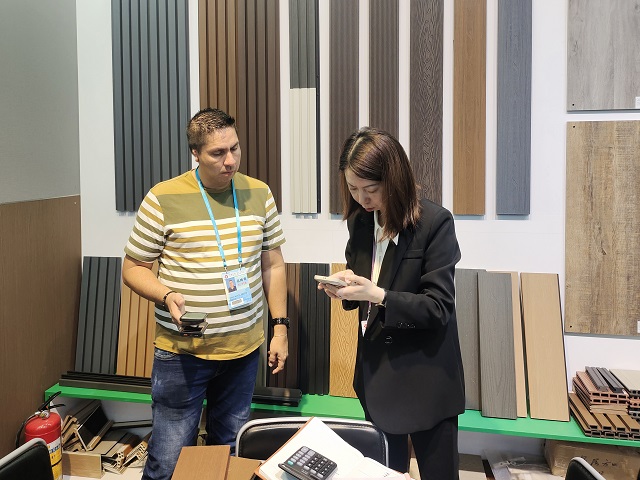 建材展位重點推出了墻板,格柵,樓梯踏板以及木塑戶外地板等新產品,從室內到戶外產品一應俱全。參展部門根據對去年秋季交易會的考察分析以及近期客戶最新詢盤情況的整合梳理,積極開拓更新參展產品。結合國外最新流行的趨勢,推出了拼花木紋,石紋等當下十分暢銷的花色。利用立體燈箱,將產品優勢,產品結構剖面等信息直觀展示,讓客戶更加清晰地了解產品的性能和優點,吸引諸多專業買家的觀看和洽談。此外,在攤位新增產品拼裝的體驗區,增加產品小樣及配件的DIY拼裝,吸引客戶自己動手,大大提升了參與度和體驗感,讓客戶真切地感受到安糧的誠意與新意。